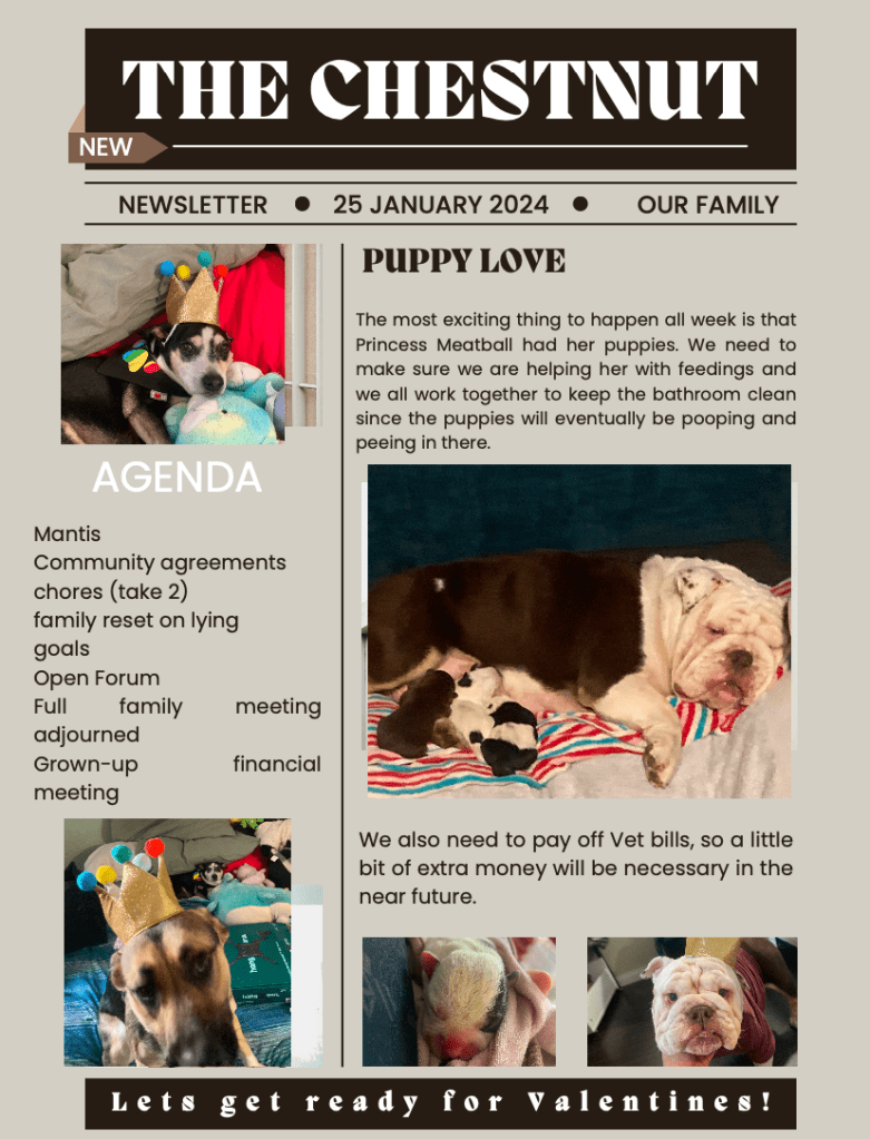 - Family Meetings are non- negotiable. I don’t care if your kids are toddlers, teens, or any age between, if they are able to communicate, they are old enough to have a voice in your family. We started doing weekly family meetings early on, and although we don’t do them as often now, they were super helpful during the first year of us blending our family. I would type up a short newsletter/agenda for the meeting and we would set aside about an hour one day a week where we would discuss the big things going on in our lives. (Attached below is an example of one of those newsletters).